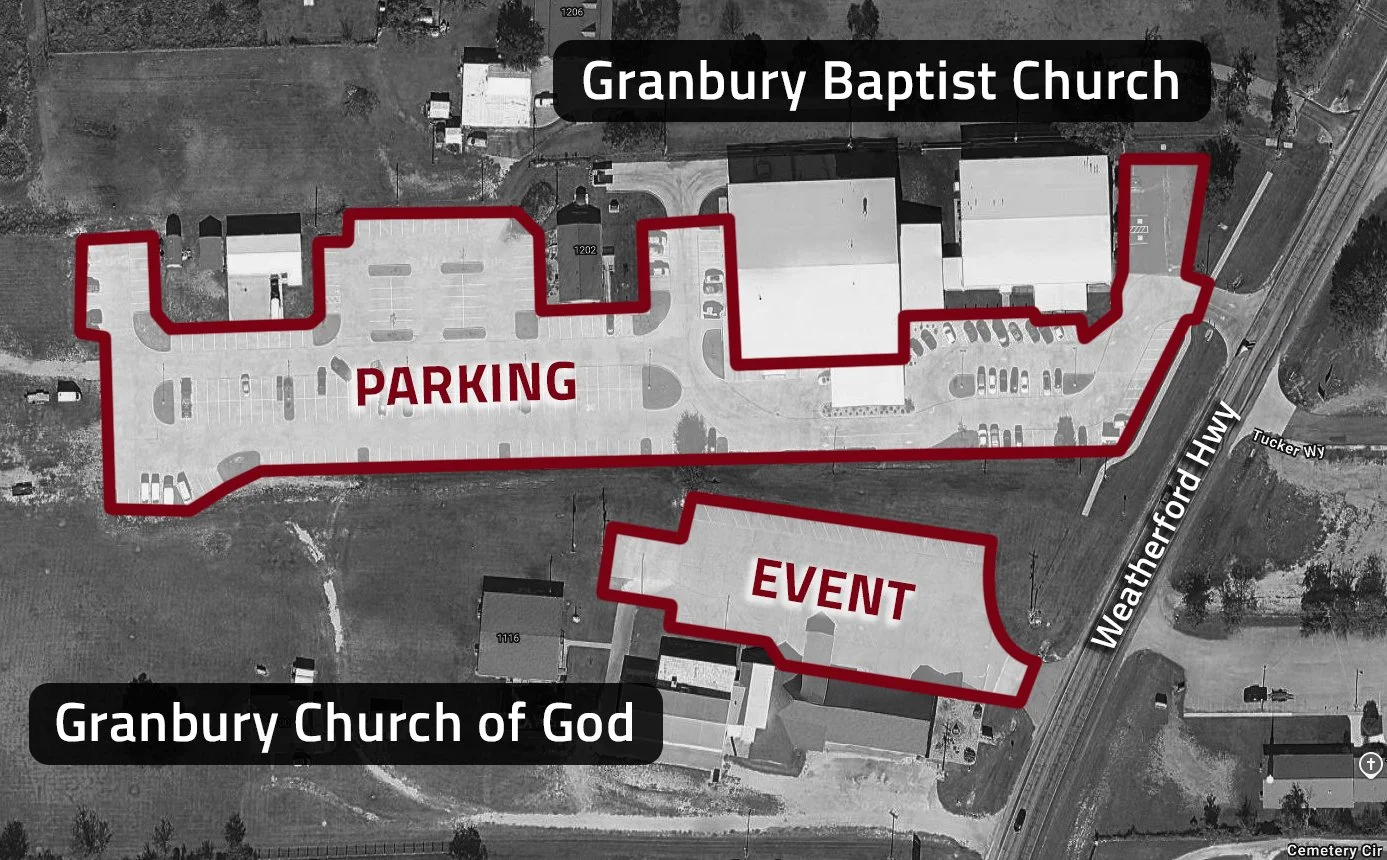 Please park in the Granbury Baptist Church parking lot. You will be able to walk across the grass to the Event Area at Granbury Church of God, up the hill. Golf carts will be on site for anyone needing assistance. USE CAUTION WHEN ENTERING AND EXITING WEATHERFORD HIGHWAY.